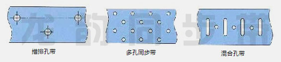 打孔同步帶分為三種形式:措排孔帶 、多孔同步帶、混合孔帶。如下圖所示: