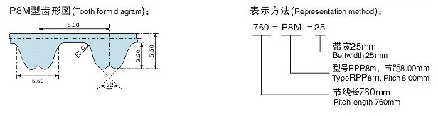 RPP8M橡膠單麵齒同步帶設計參數:齒形為齒型為兔牙型,轉彎效果好,適合高速傳動。 標準設計參考值:節距:8mm;齒高:2.90mm;帶厚:5.5mm
